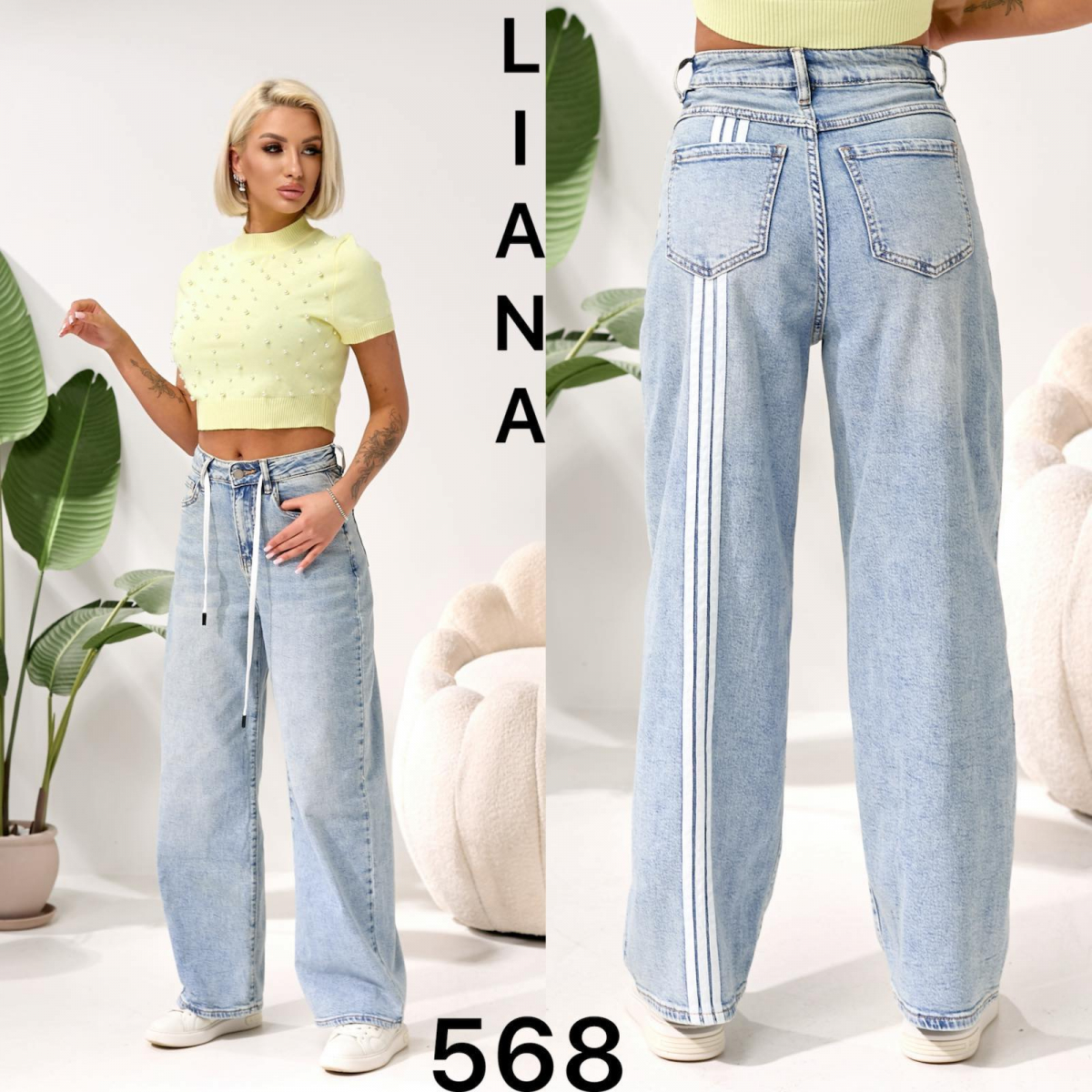 Стильні жіночі джинси з високою посадкою — ідеальний вибір для повсякденних та street-style образів. Модель 568 виконана з якісного блакитного деніму, добре тримає форму та комфортно сідає по фігурі.