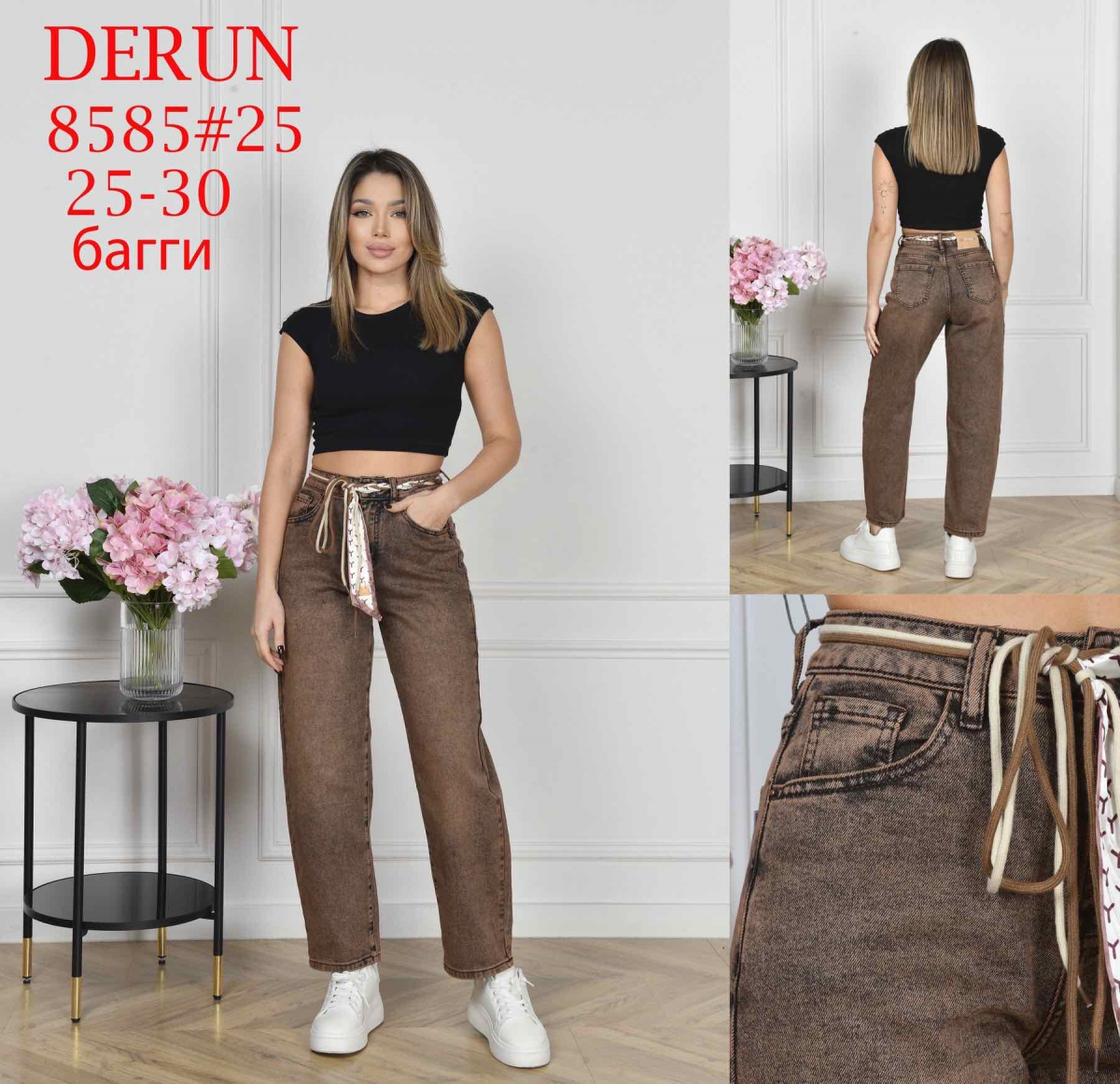 Женские джинсы BAGGY DERUN – стильная и удобная модель из новой коллекции весна-лето для оптовых закупок. Свободный крой baggy обеспечивает комфортную посадку и актуальный силуэт, а пояс со шнурком придает удобство в повседневной носке.